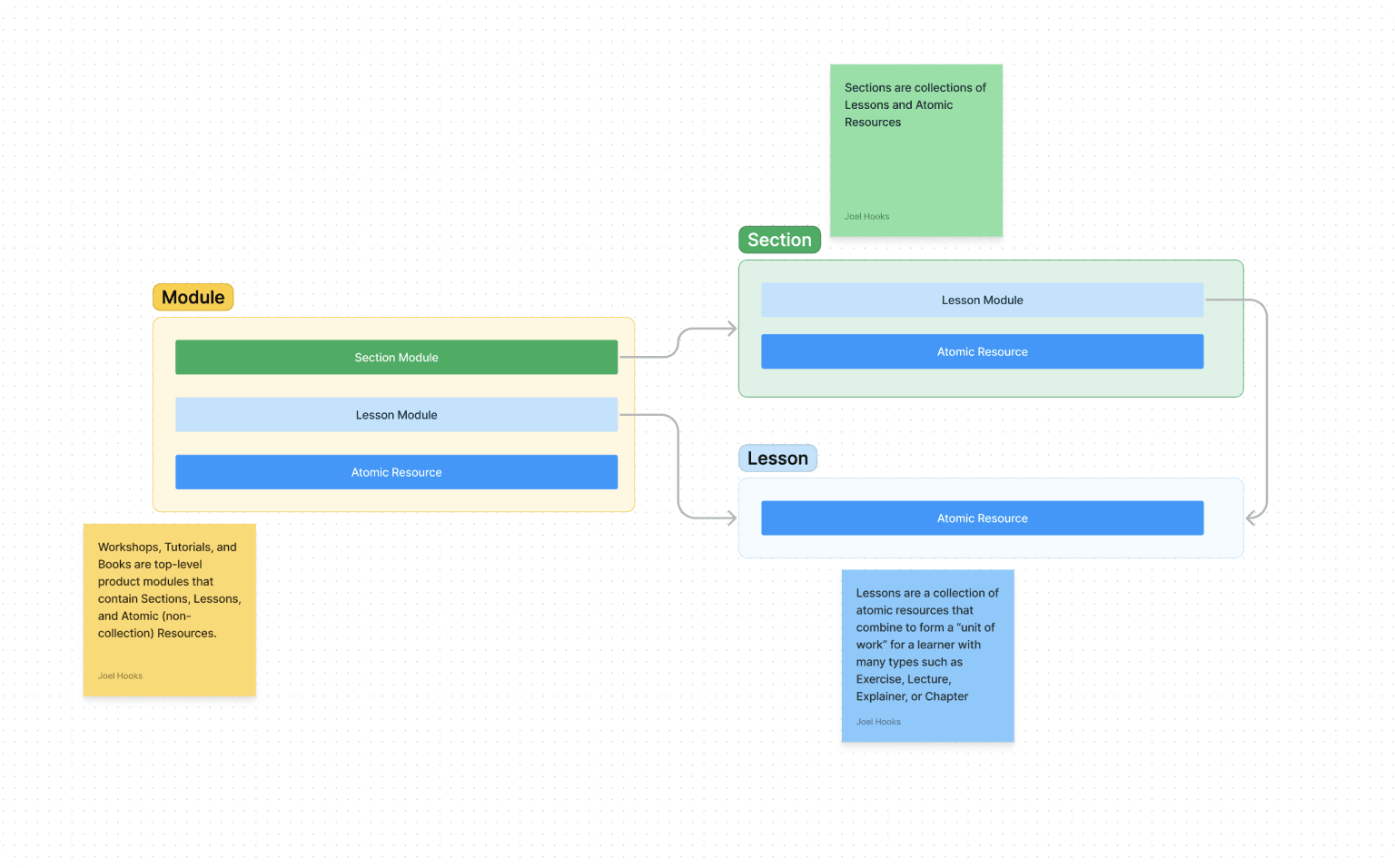 Finally modules, lessons, and other resources are combined into a Product