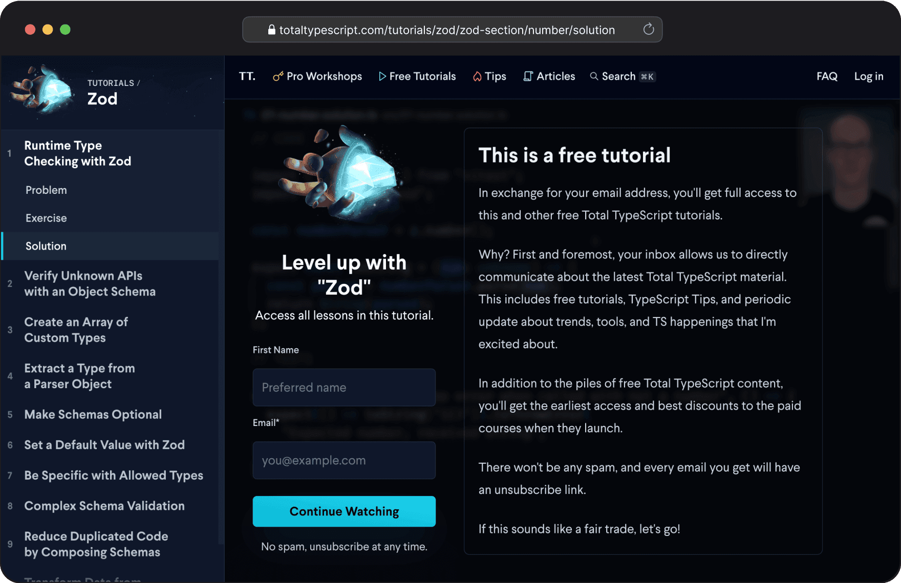 Matt had an idea for a video tutorial around the Zod library for TypeScript. Rather than his initial inclination to publish it on YouTube, we suggested that he create the videos and our team create an elevated and engaging experience on the Total TypeScript website using the Skill Stack platform. The result was problem/solution exercise pairs that include an interactive IDE to give the learner the opportunity to try to solve it before watching Matt do so. The first problem video of the Zod tutorial is free to watch, but the first solution asks for your email address and lets you know why we want it.